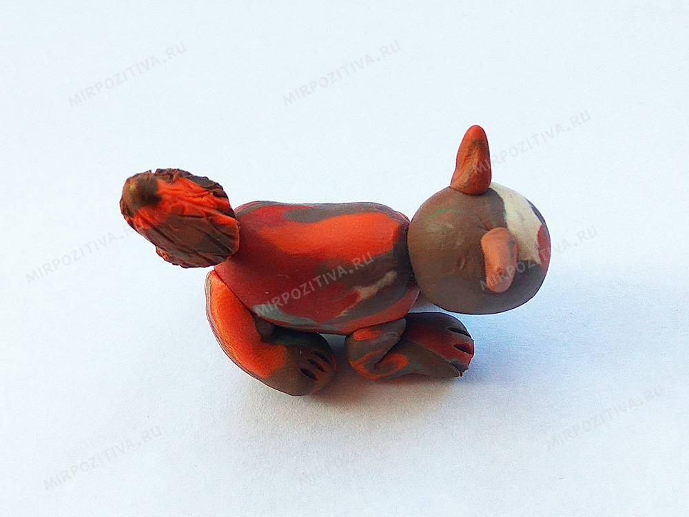 12.Лапки-колбаски и канатик-хвост присоединяем к туловищу. Можно крепко придавить их, либо же, для того чтобы лапки и хвост оставались подвижными, прикрепить детали с помощью зубочисток или спичек.