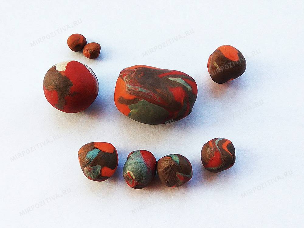 Шаг 2. Возьмите несколько кусочков пластилина и смешайте их между собой. Здесь были использованы коричневые разных оттенков, оранжевый, белый, бежевый, серый и другие цвета. Смешайте их, но не размешивайте полностью, иначе масса будет казаться просто грязной. Должны оставаться небольшие латки. Такой интересный цвет.