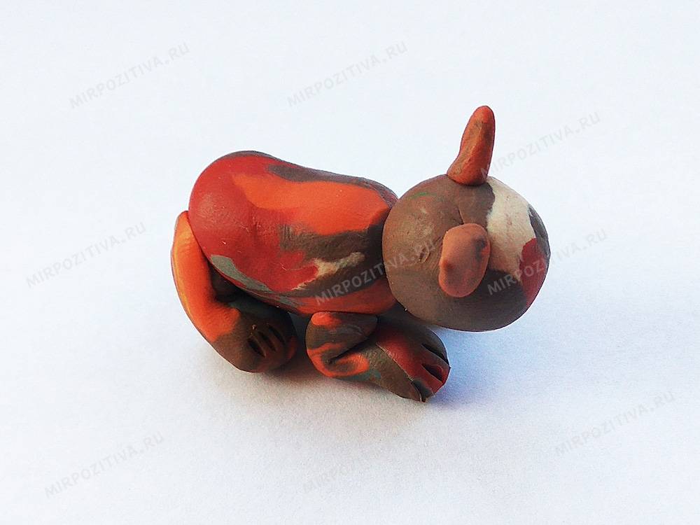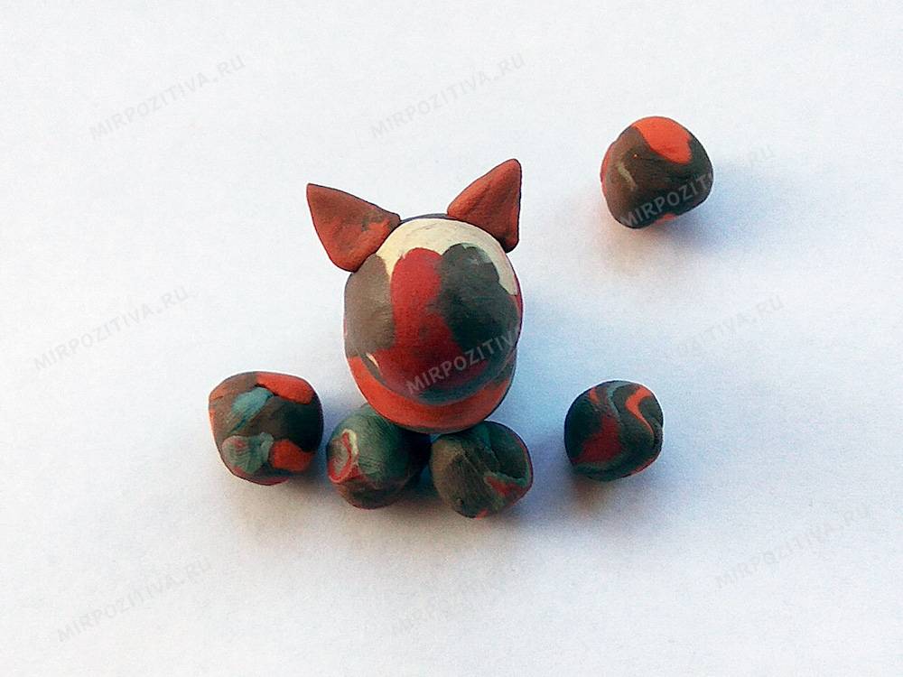 - Из оставшегося куска пластилина катаем овал для хвоста, два небольших шарика для лап и два маленьких шарика, которые нужно заострить вверху для ушей.