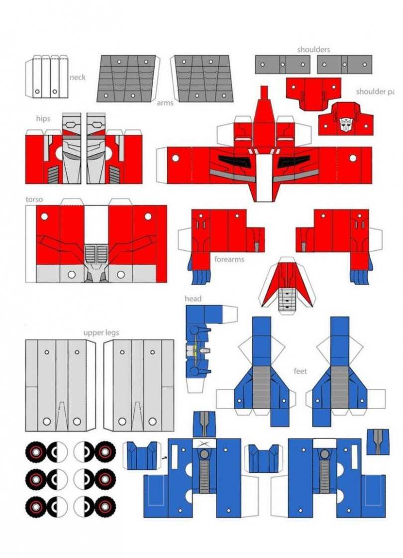 - Начертить четыре квадрата для кабины. На другом листе начертить три прямоугольника и два квадрата для кузова. Отдельно взять лист, сложить вдоль на три части, склеить треугольником – это будет крепление для ракет.