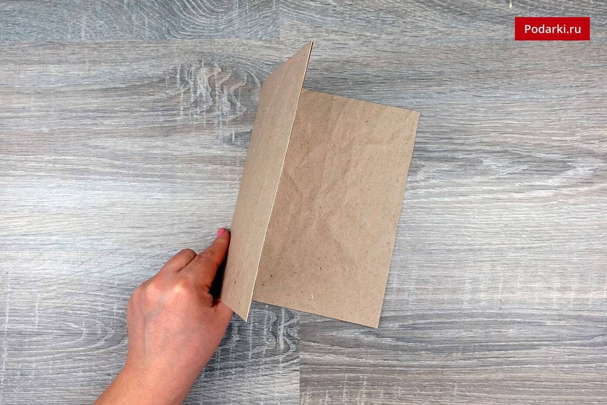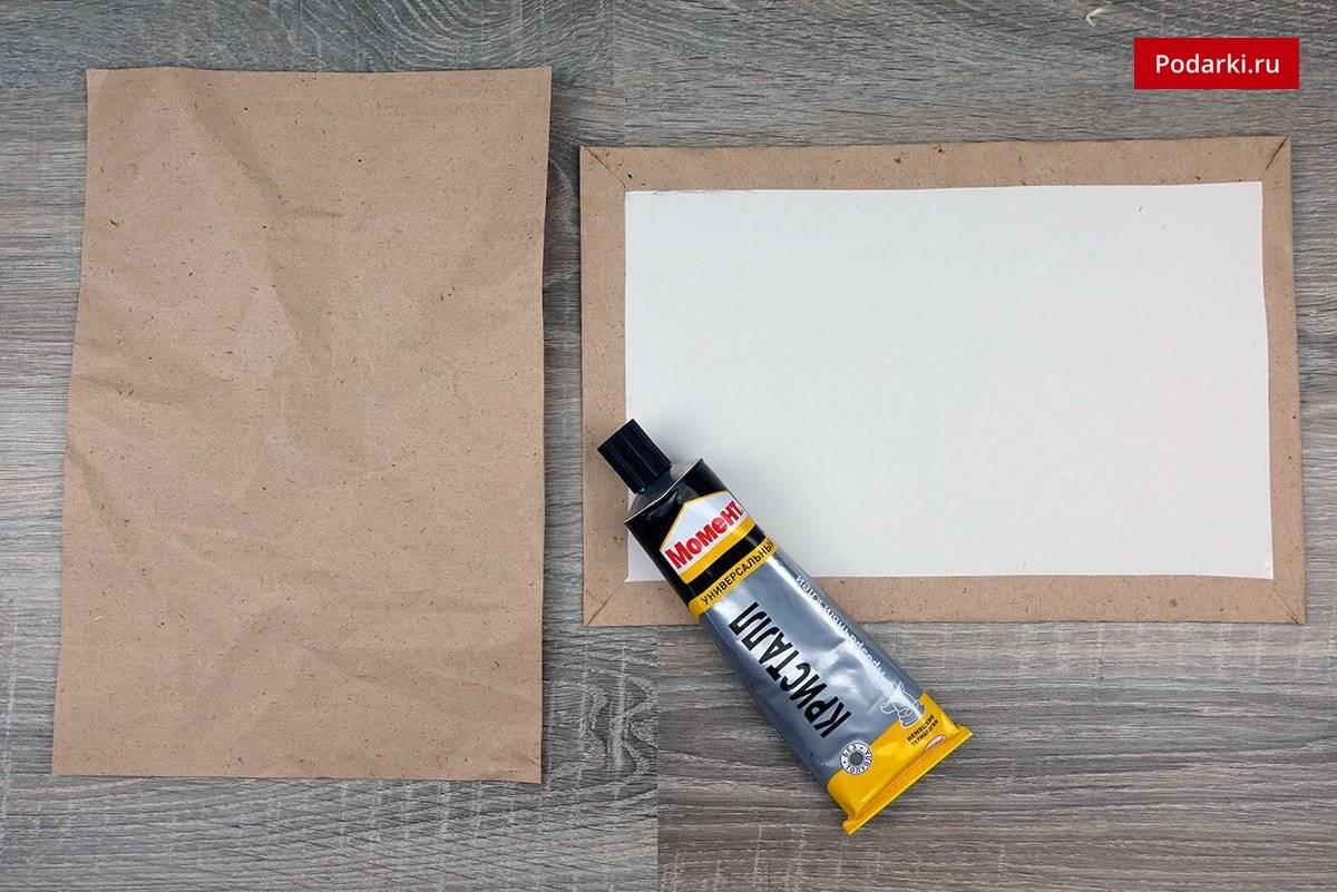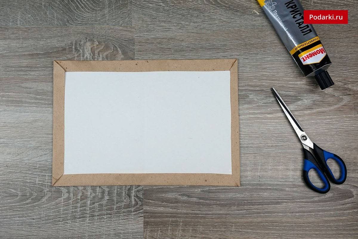 На лист белого плотного картона (основа) следует приклеить фон из крафт бумаги (размер кусочка должен быть на пол сантиметра меньше основы открытки). Клеить бумагу лучше всего сухим клеем (клей-карандаш), чтобы не оставлять мокрых следов и не позволить бумаге принимать неправильную форму.
