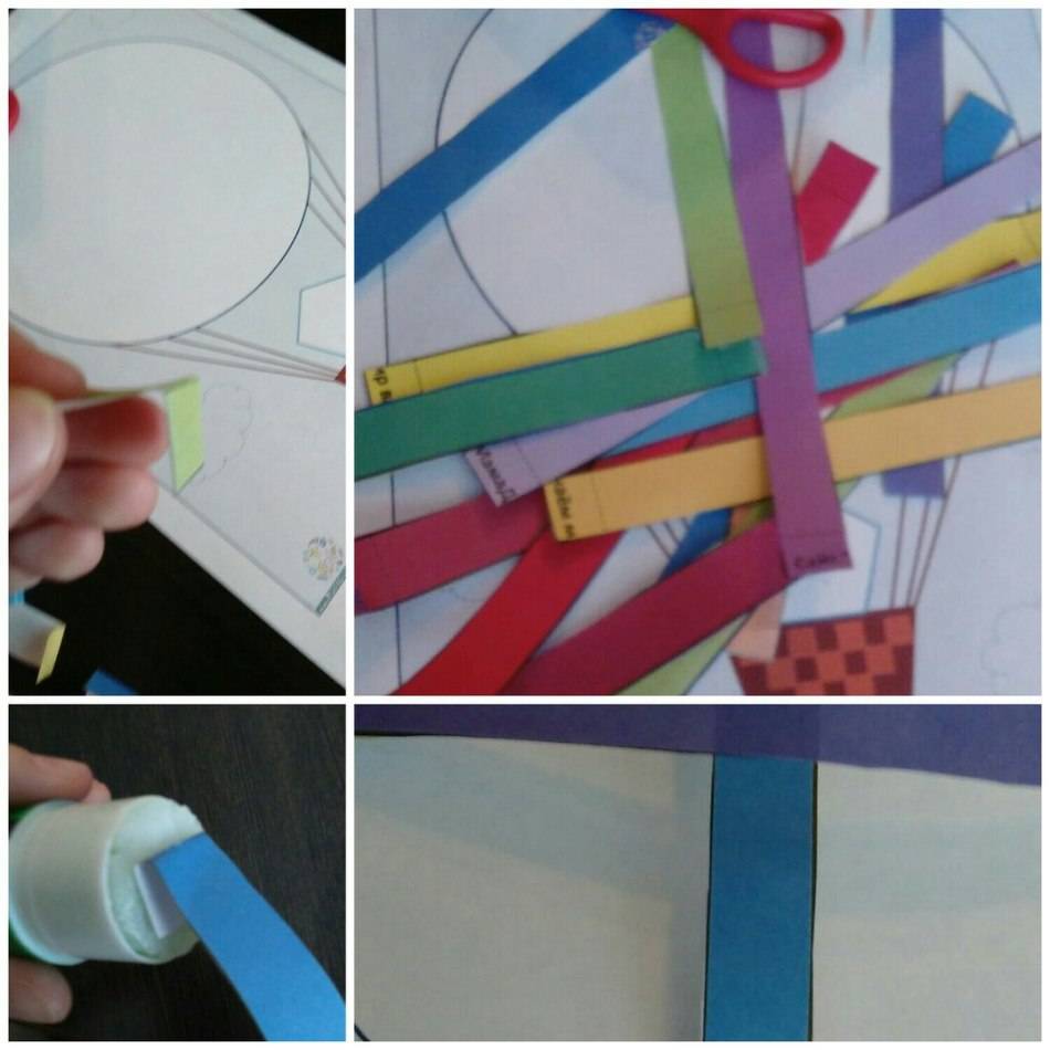 Очень часто для изготовления шара с корзиной используется техника аппликации. Собственно такой вариант тоже идеально подойдет для малышей дошкольного возраста. Он тоже помогает развивать мелкую моторику рук, а также обращаться с канцелярскими принадлежностями.
