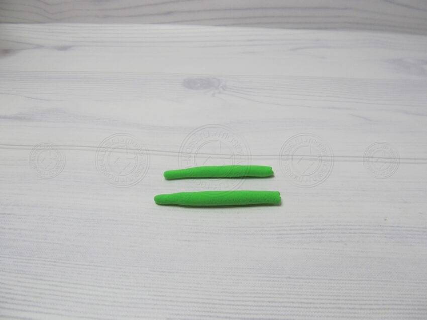12. Из пластилина того же цвета скатаем еще одну колбаску, с прямым и ровным основанием, и скругленным верхом. Вторая деталь — это лист, который проще вырезать ножом из плоского листа материала. Когда закончите, изобразите на нем текстуру в виде продольных линий.