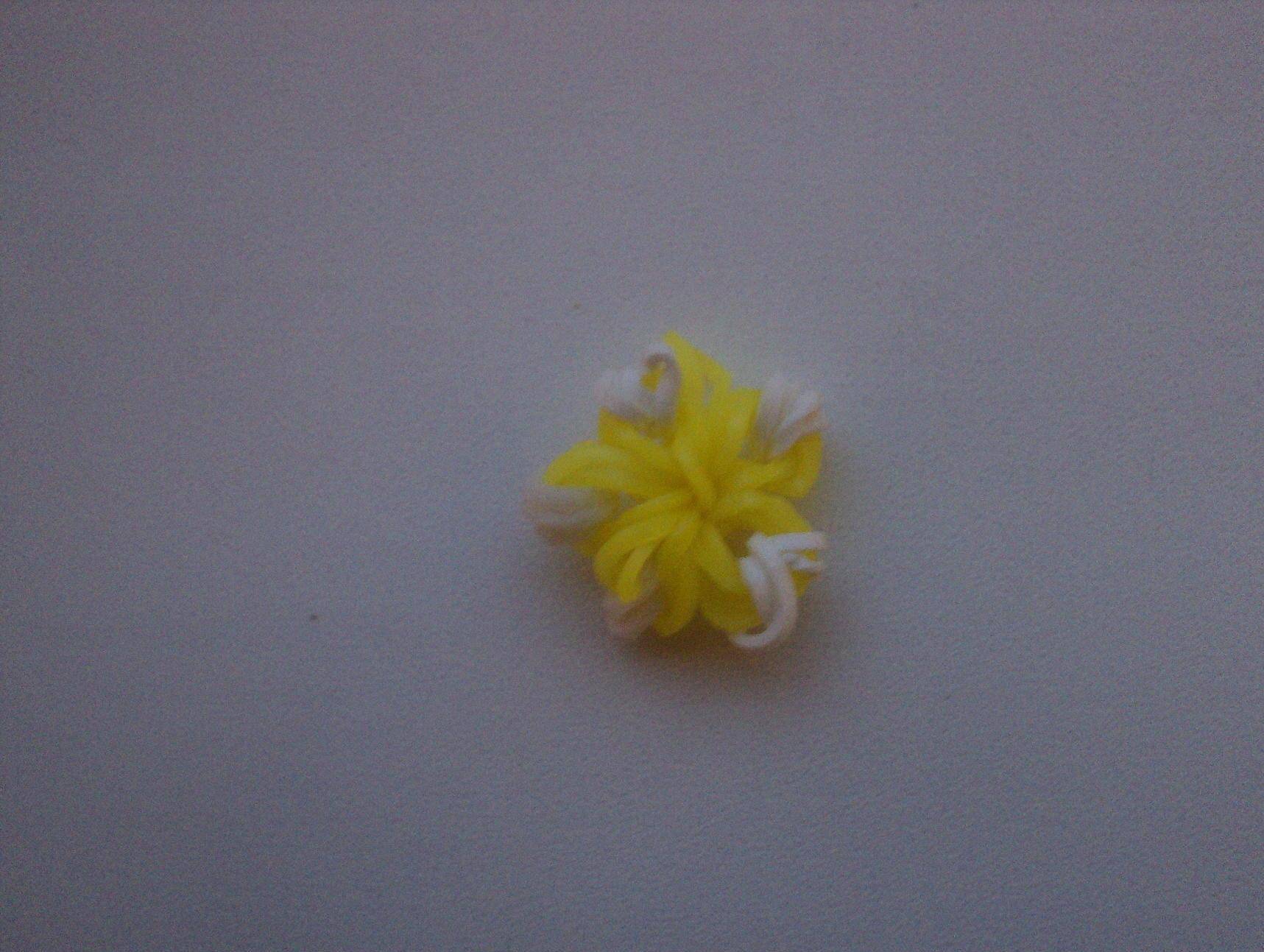 Их надо сбросить на одну желтую и затянуть ее в узелок. После этого необходимо прикрепить готовый цветочек к платью с помощью еще одной резиночки.