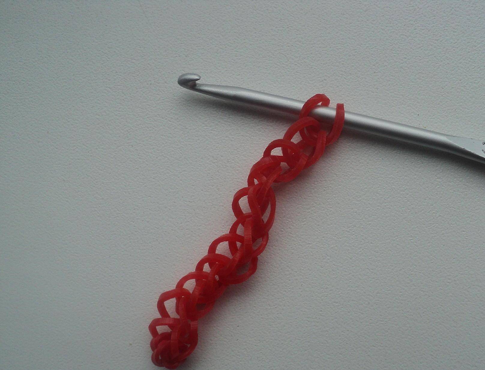 - Наберём цепочку из трёх пар резинок и заведём крючок в первую резинку. Сдвинем эту деталь, приближая к ручке крючка, и создаём ещё одну такую же деталь.