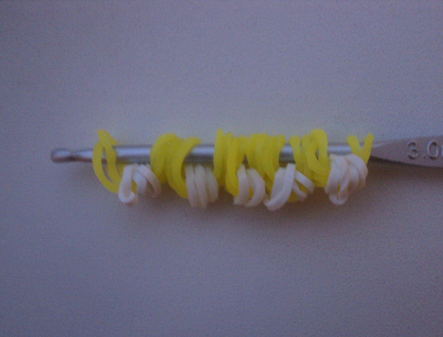 Далее берем резинки белого цвета и плетем 1 рядочек по поперечным деталям предыдущего ряда.