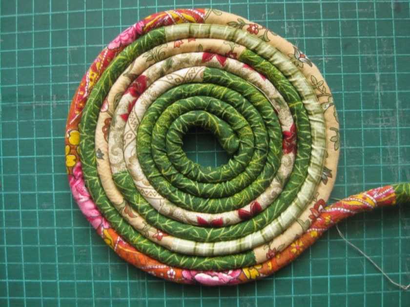 Готовая коса сворачивается спиралью, витки периодически сшиваются между собой для крепости всей конструкции. Хвостик прячется в последнем витке и тоже тщательно прошивается. Вместо сшивания витков можно использовать технологию их связывания с помощью бечевки или тонкой веревки.