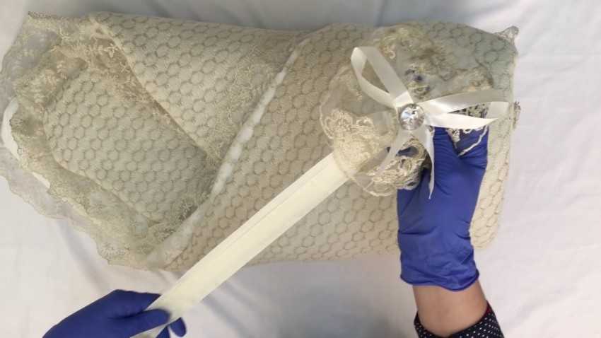 Зафиксировать сложенное одеяло можно также при помощи ленты. Такую ленту декорируют бантиками, брошками. Бантики также можно сделать самостоятельно из остатков ткани. Почерпнуть идеи декорирования можно из фото одеял на выписку.