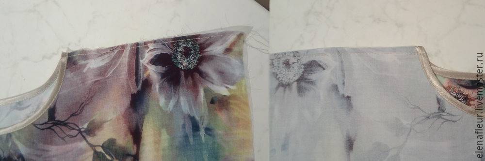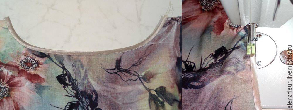 Прокладываем по линии строчку. Это сделать желательно, но не обязательно, так как ткань тонкая, легко растягивается во время дальнейшей обработки. Вырезаем горловину, отступив 3 мм от шва.