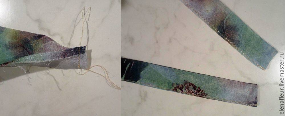 8. Шьем пояс. Складываем пояс вдоль пополам, отгибаем припуски на шов 0,5 см наружу, прошиваем. Выворачиваем, проглаживаем.
