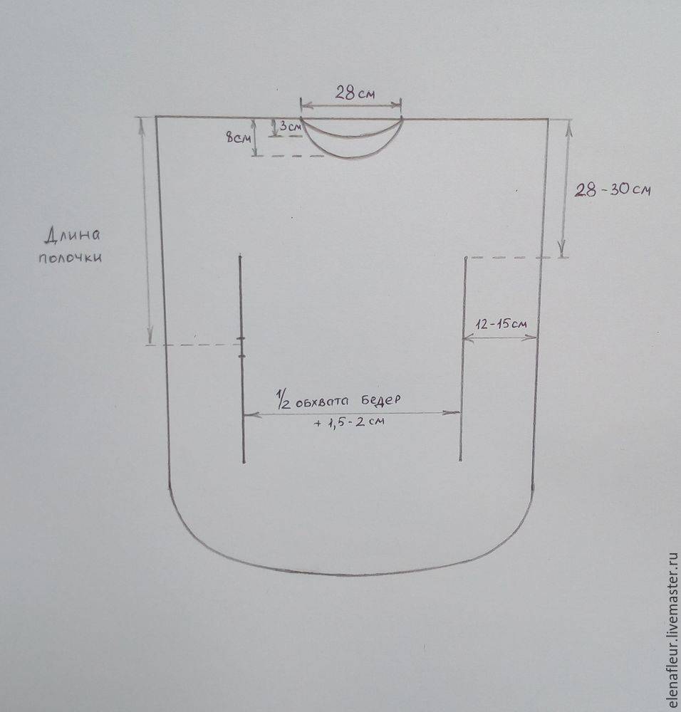 - Начало работ проводится так, как и в первом варианте. После того, как вырезана горловина и определен центр будущего изделия, отмеряется линия, которая равно половине от полуобхвата бедер с прибавлением 2,5 см.