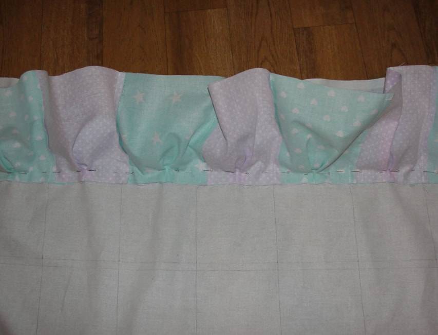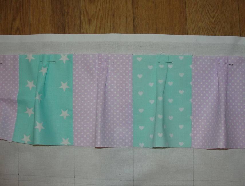 Пожалуй, самое сложное – пришить следующую полосу. Для начала ее необходимо сложить в складки и только после этого пришить к первой полосе лицевой стороной