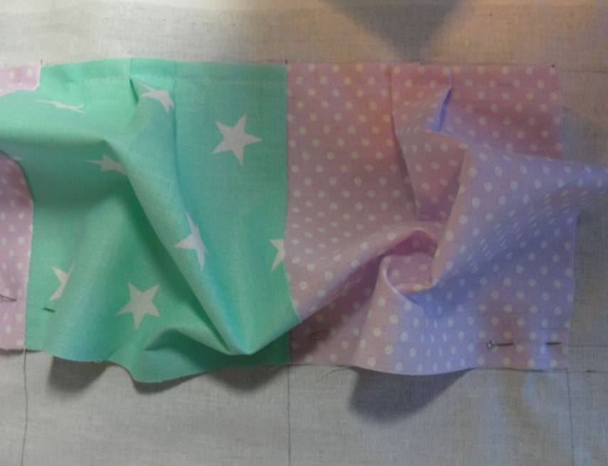 4. Прикалываем полоску к основе булавками и формируем складки. Прошиваем сначала верх квадратов, а потом боковые швы. Следим за тем, чтобы швы совпадали с линиями на основе.