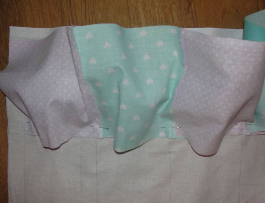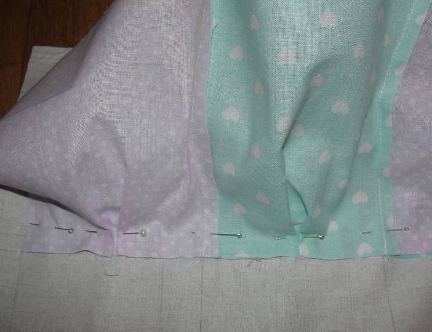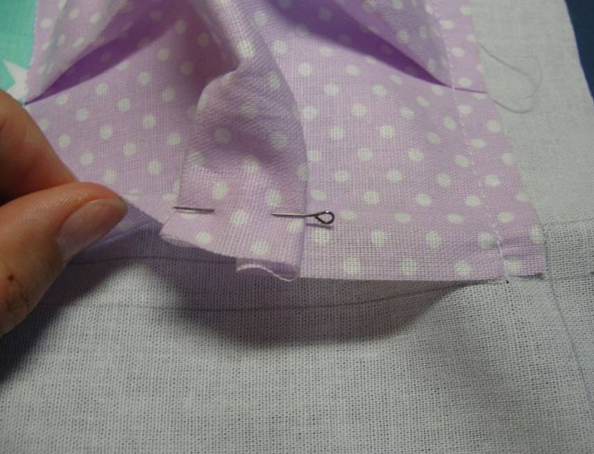 По нижней стороне делаем складки и фиксируем их булавками, но не прикрепляем к основной ткани.