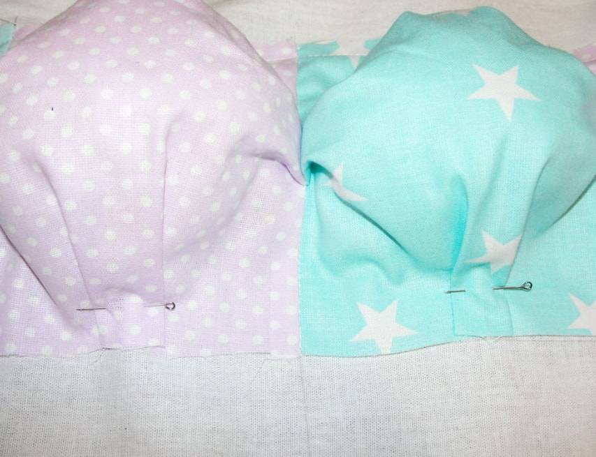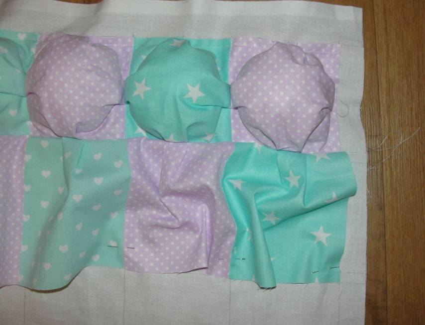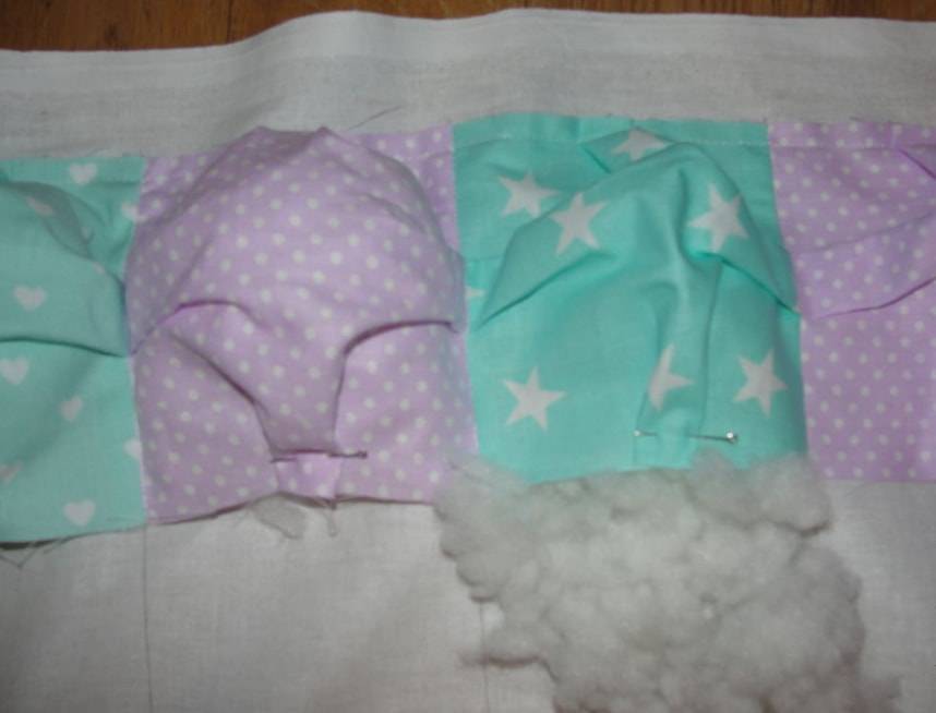 5.Делаем складки внизу квадратов не скалывая их с основой и набиваем холлофайбером получившиеся кармашки.