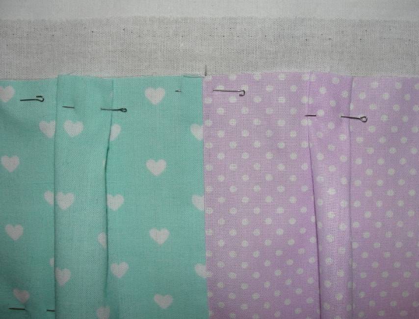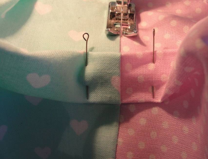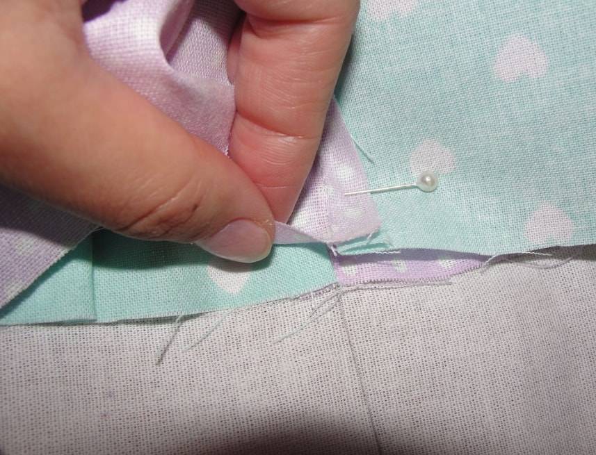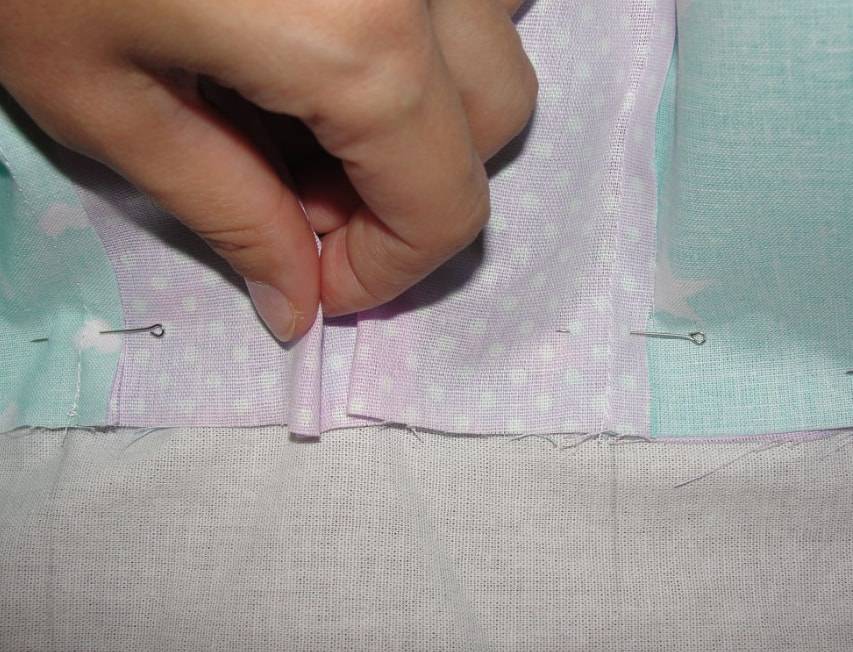 Прикладываем цветную полоску к основной ткани и фиксируем ее булавками. В процессе делаем небольшие складки, как показано на фото.