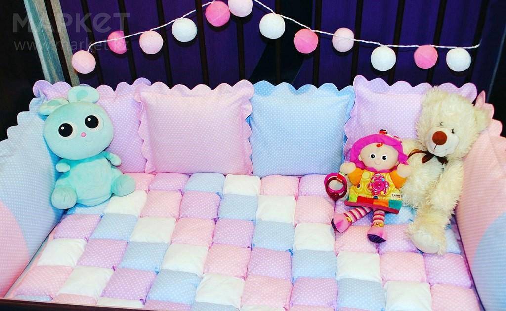 Как уже было сказано, выбор расцветки ограничен лишь вашими вкусами. Это может быть розовое, бирюзовое, белое, желтое, одеяло мятного цвета, голубое и т.д. Необязательно использовать однотонные ткани, можно добавить также оригинальный принт, например, изображение полосок, треугольников, кружочков, небольших схематичных изображений животных, облаков и т. п.