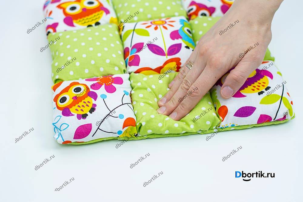 Расположение складок находятся по центру сторон квадратов. Для набивки разрезается нижний квадрат на 3-4 см., после набивки зашивается. Верхние и нижние квадраты сшиваются по периметру. Далее квадраты сшиваются в полосы, затем полосы сшиваются в полотно. Затем сшиваются передняя и задняя стенка изделия по четырем сторонам, оставляя отверстие для выворачивания, примерно 20-25 см. Потом набиваются квадраты. Подушки за счет плотной набивки получаются выпуклыми и упругими. Данная техника подходит для пошива бортиков или коврика.