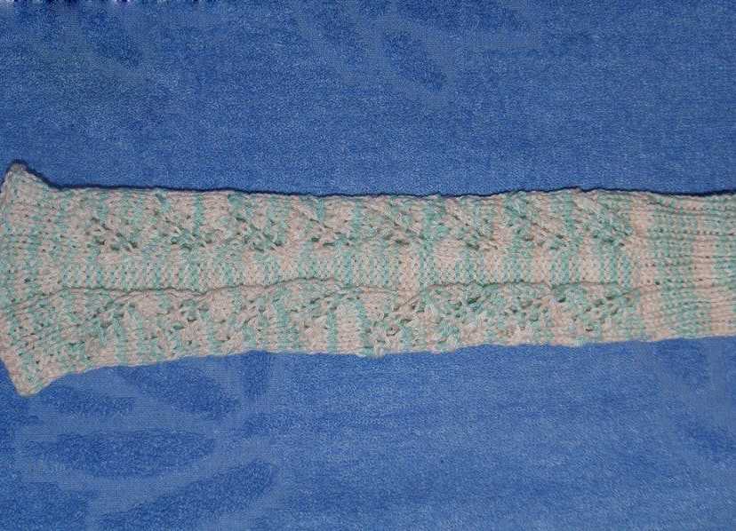 - Вязание продолжаем до конца изделия. Особенность данного метода в том, что полотно вяжется не по кругу. В конце вязки гетры сворачиваются в трубу и сшиваются.