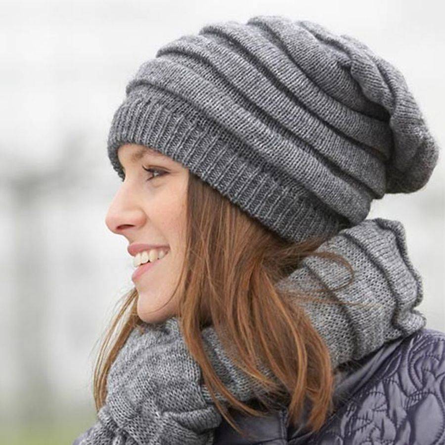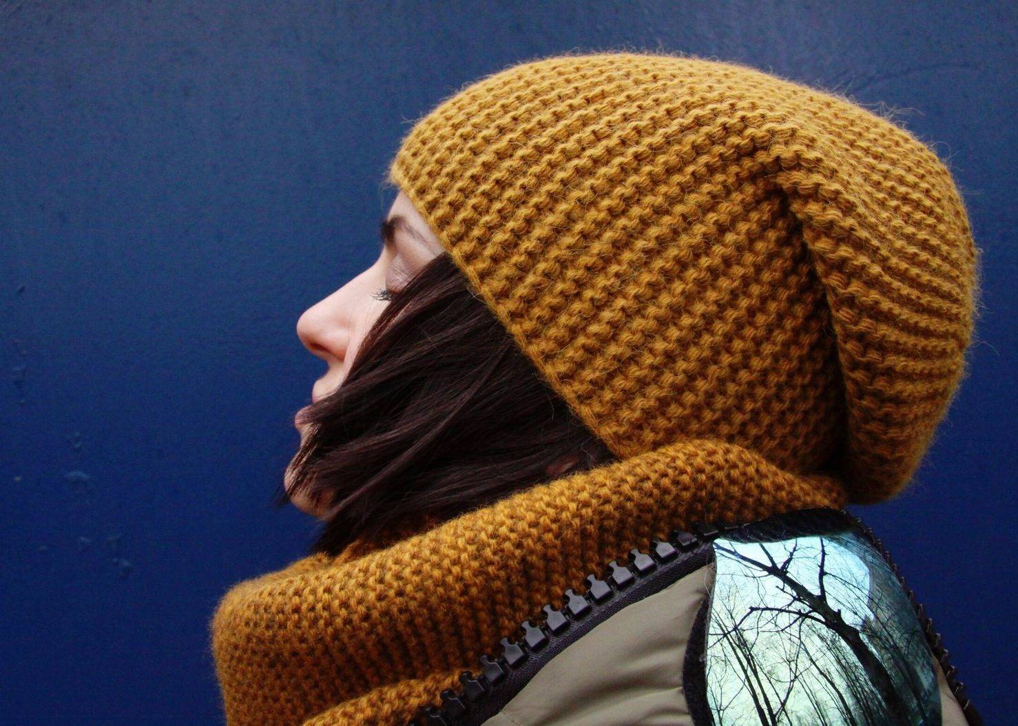 - Сегодня в моде шапки крупной вязки, но полиэфирная мега-пряжа с полой сердцевиной выпускается для пледов, сумок и ковров. Это не лучший выбор для шапочек, но можно сплести снуд на руках буквально за пару часов.