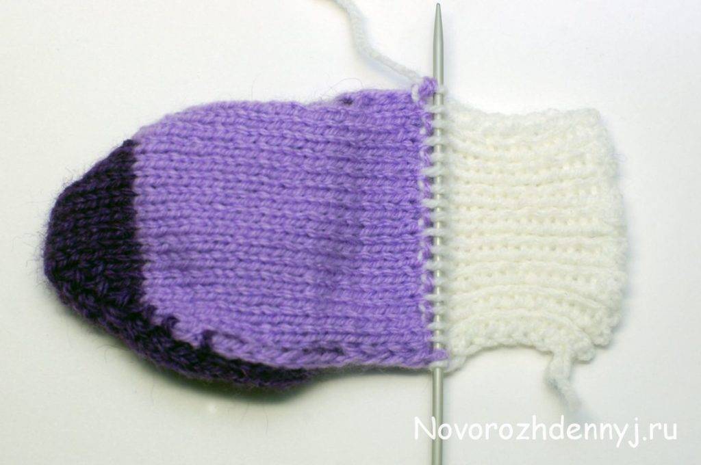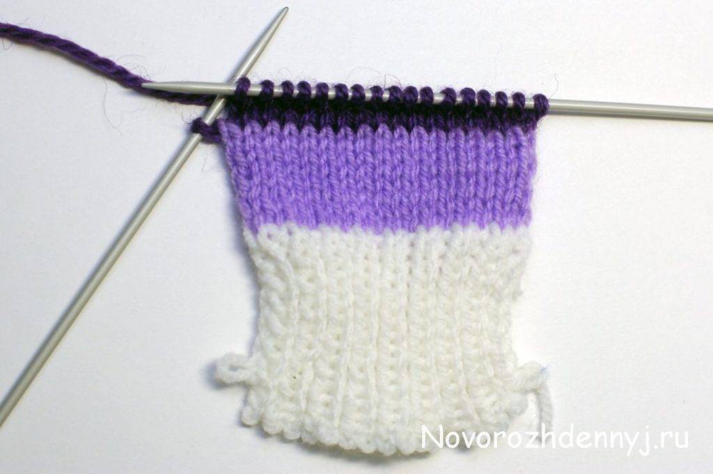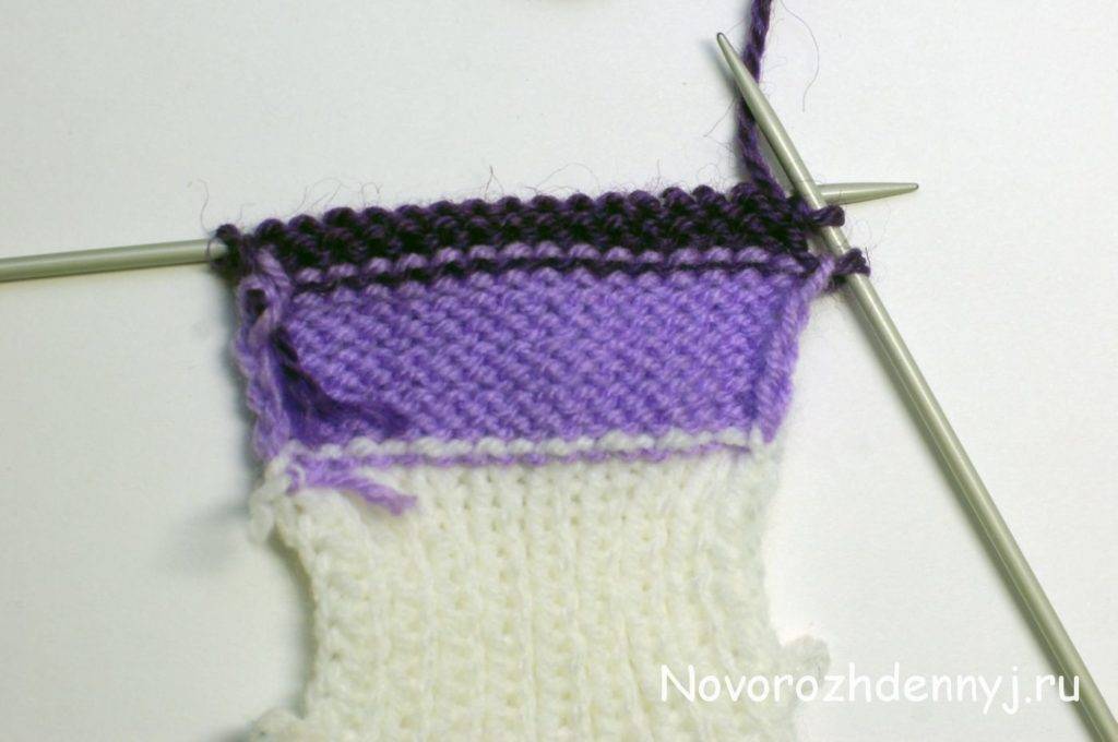 5 — 16 ряд. Продолжим вязать резинкой. 17 ряд. Берем сиреневую нитку и вяжем 18 лицевых петель (лиц.)