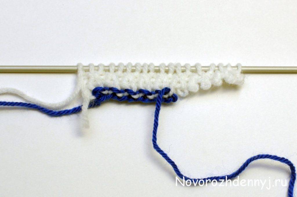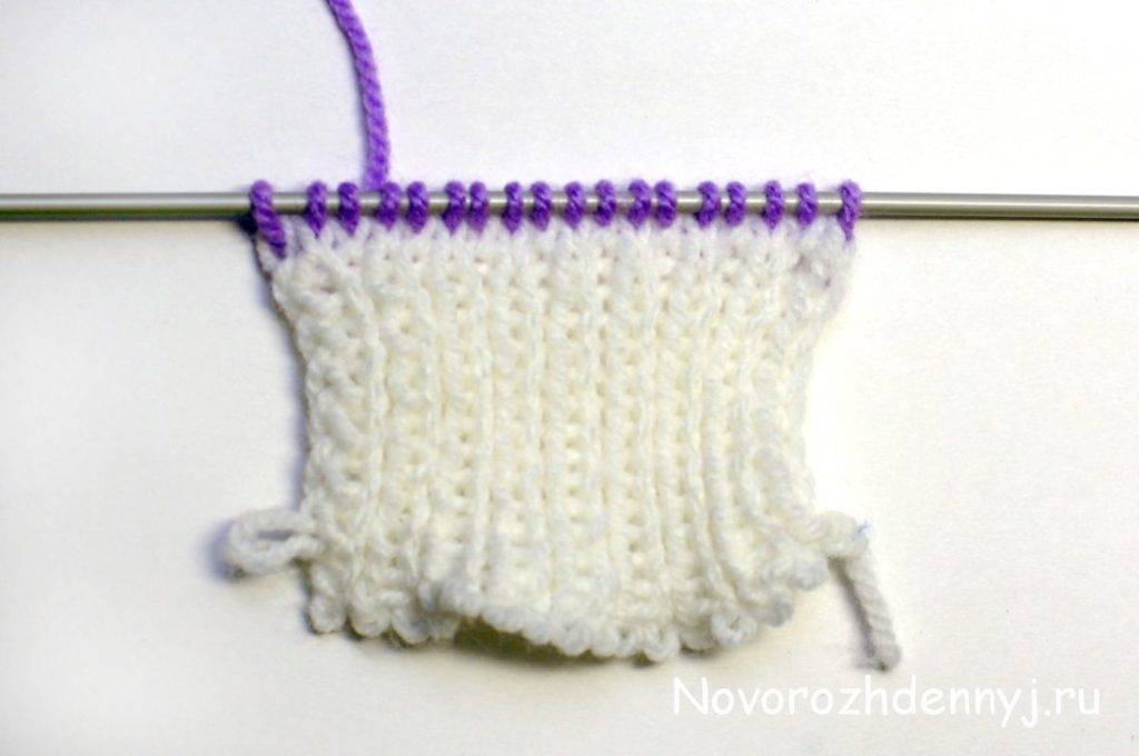 2 — 4 ряды. Вяжем резинкой, затем контрастную нитку из вязания удаляем.