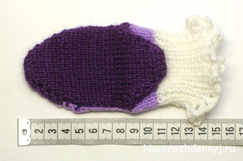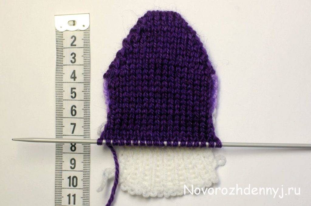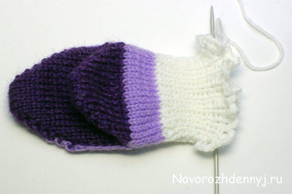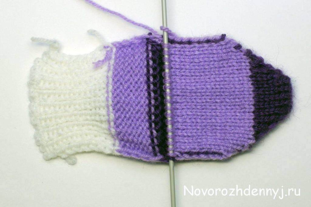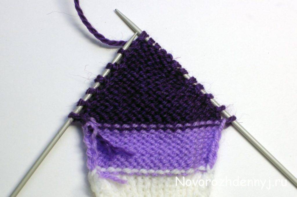 Для малыша в возрасте до полугода следует набрать на спицы 32 петли. Затем распределить равномерно на четыре спицы, по 8 петель на каждую. Сначала вяжется резинка — 2 лицевых, две изнаночных до 24 ряда. Далее с каждой спицы нужно убавить по одной петле. Для формирования пятки нужно будет объединить петли с двух спиц и вязать лицевой гладью восемь рядов. Затем 10 петель провязать лицевыми, убавив на 1 петлю, провязав две вместе. Перевернув вязание, провязать 6 петель изнаночными и также сделать убавление. Провязывается и делается убавление до тех пор, пока не спице не останется шесть петель.