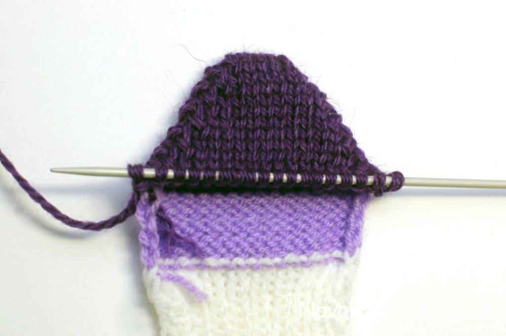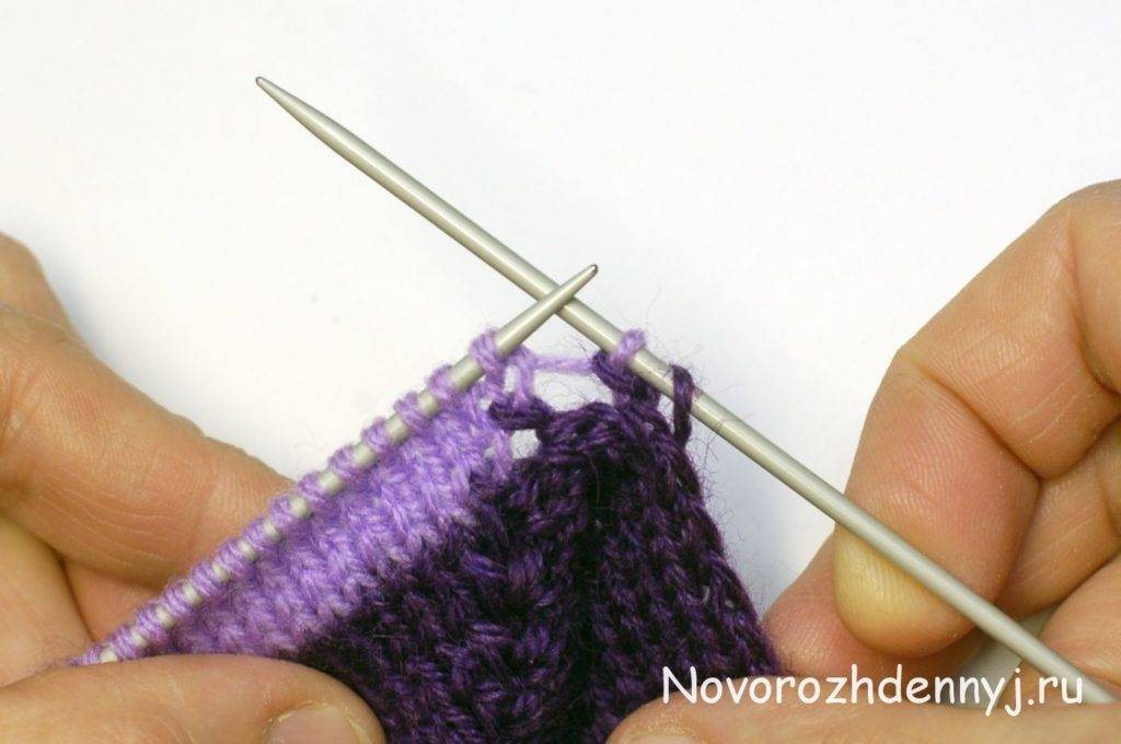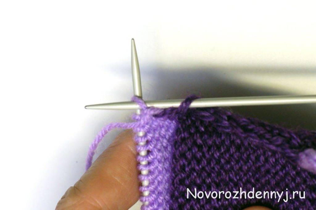 18 — 24 ряды. Продолжим вязать сиреневой ниткой носочной гладью, то есть, по лицевой стороне делаются лицевые петли, а на изнаночной — изнаночные. Первая петля в ряду всегда снимается.