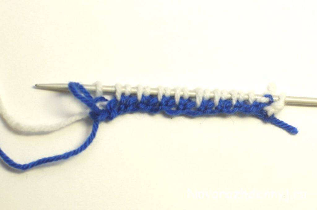 Для того, чтобы вам не мешала длинная синяя нить с изнанки – сделайте 2 синих клубка. Серой пряжей: 14 лиц. п. серого цвета , 1 лиц. п. синего, 14 п. серого цв., 1 п. синего, 14 л. п. серого. 29-й р.: 13 л. п. серого, 3 л. п. синего, 12 л. п. серого, 3 л. п. синего, 13 л. п. серого. 28-й р.: 12 л. п. серого, 5 л. п. синего, 10 л. п. серого, 5 синего, 12 л. п. серого. 27-й р.: 11 л. п. серого, 7 л. п. синего, 8 л. п. серого, 7 л. п. синего, 11 л. п. серого. 26-й р.: 10 л. п. серого, 9 синего, 6 серого, 9 синего, 10 серого. 25-й р.: 44 л. п. синего цвета.