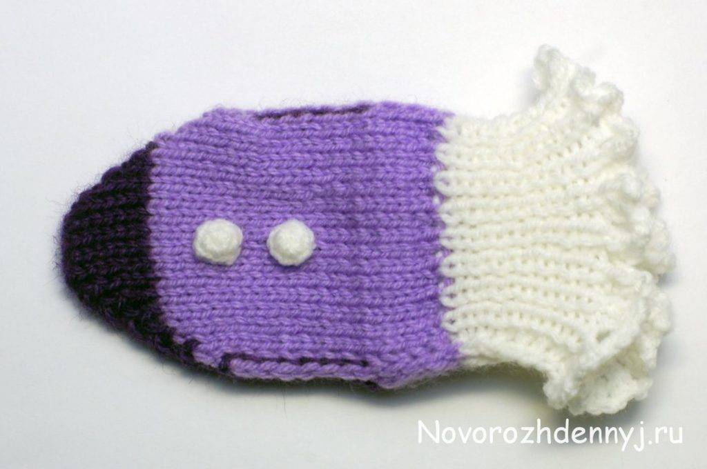 Пришиваем пуговки на сиреневое поле. Носочки на двух спицах без шва для малыша до года готовы. Вязка простая, потому справится любой начинающий в этом деле человек.