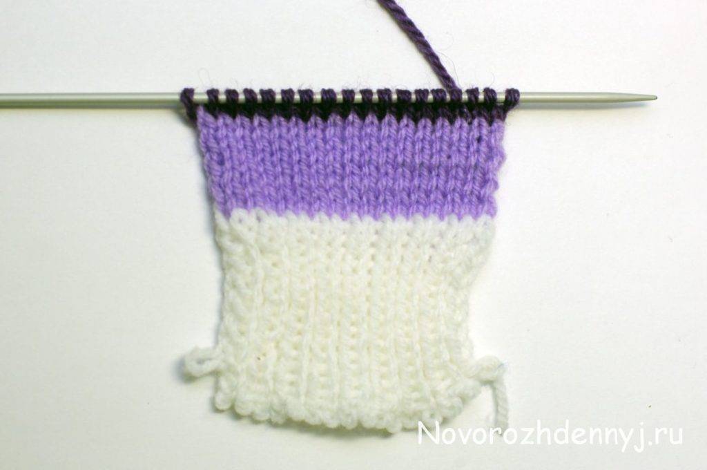 111 ряд. Здесь сиреневые ряды закончились и меняем нитку на белую. Техника вязания не меняется, но вяжем уже не носочной гладью, а резинкой, одна лицевая петля, одна изнаночная.