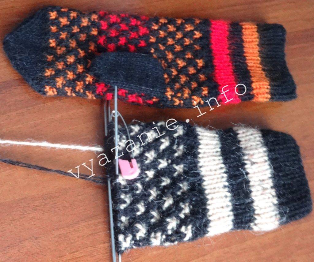 - По основному рисунку провязываем варежки вкруговую до основания большого пальца. В этом месте нужно делать отверстие.