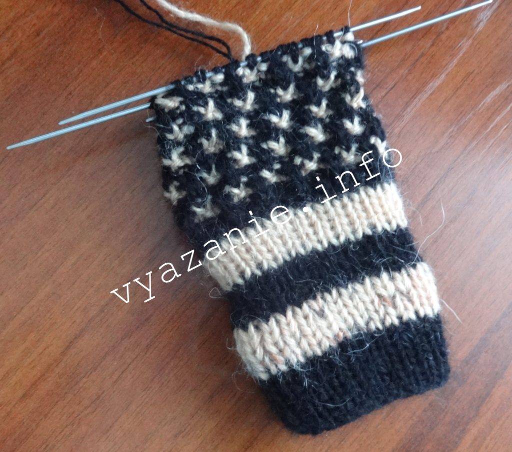Дойдя до уровня большого пальца, перевести 5-8 п, предназначенных для вязания пальчика, на булавку или цветную нитку. Продолжать поднимать основу работы по кругу гладью или по узору.