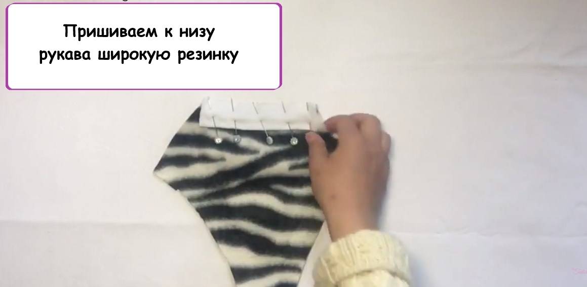 К самому низу рукава, там где он будет заканчиваться на лапке, пришиваем широкую мягкую резинку. Складываем ее вдвое и вставляем посредине необработанный край ткани. Так, пришив резинку, мы заодно и обработаем шов.