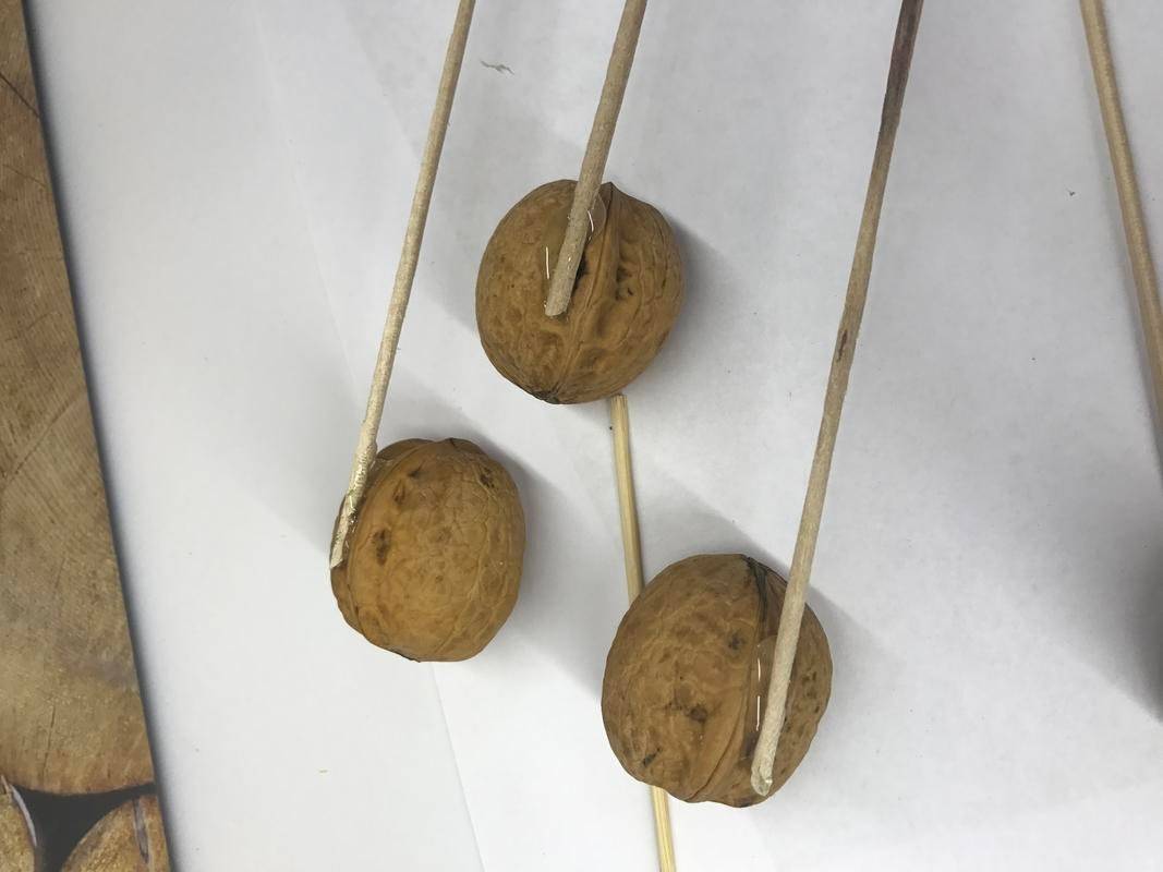 - Прикрепите деревянные палочки с 2-х сторон колбасок, чтобы потом согнуть в дугу.