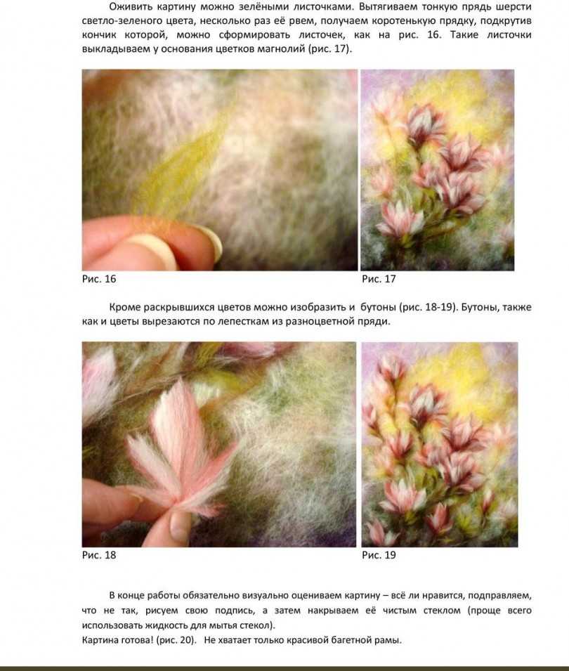 Настоящими произведениями искусства выглядят панно, и картины из цветов из шерсти. В работе используются те же материалы и инструменты, что и для других войлочных цветов. Но добавляют текстиль (марлю) для основы и рамку для картины.
