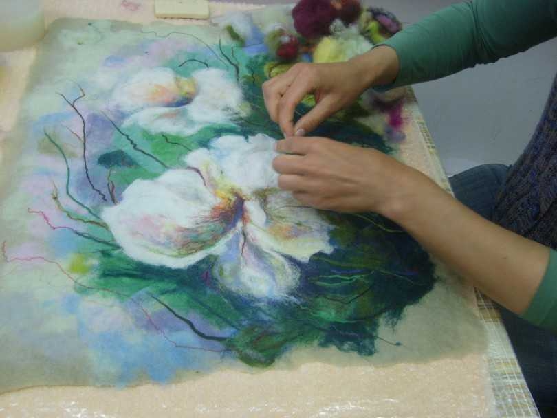 - В процессе работы можно добавлять новые кусочки шерсти, создавая запланированную композицию и добиваясь её соответствия выкройке.