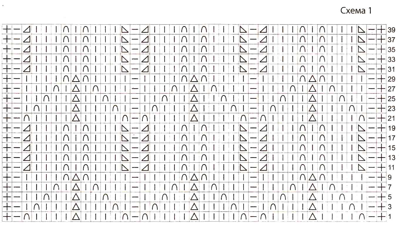 - Главный рисунок вяжите по схематической таблице №2: 1 раз с 1-го по 3-й ряд, затем повторяйте 2-й и 3-й ряды