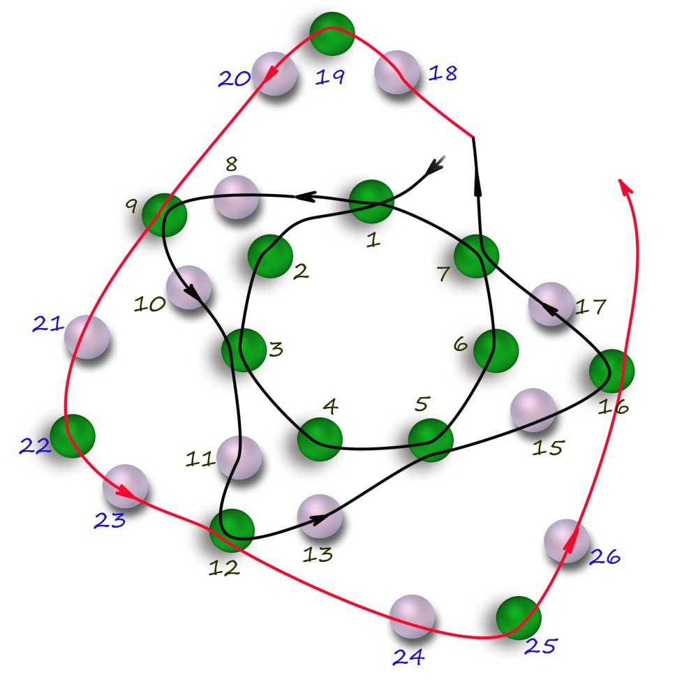 - Далее, согласно схемы, набираем три черных бусинки и одну красную. Конец опять протягиваем три красных элемента и сдвигаем вверх. Затем конец лески нужно просунуть в оставленную красную бисеринку. Получилась петелечка. Из таких фрагментов и будет состоять весь жгут;