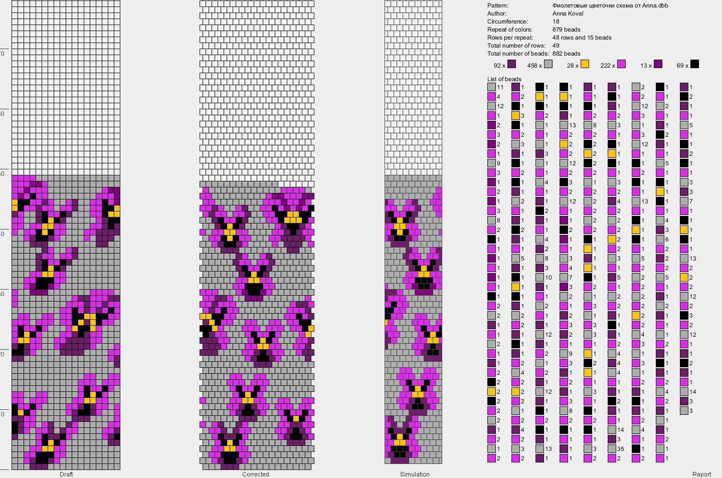 - «Повторение цвета» даёт сведения о бисеринах и их количестве в одном раппорте;