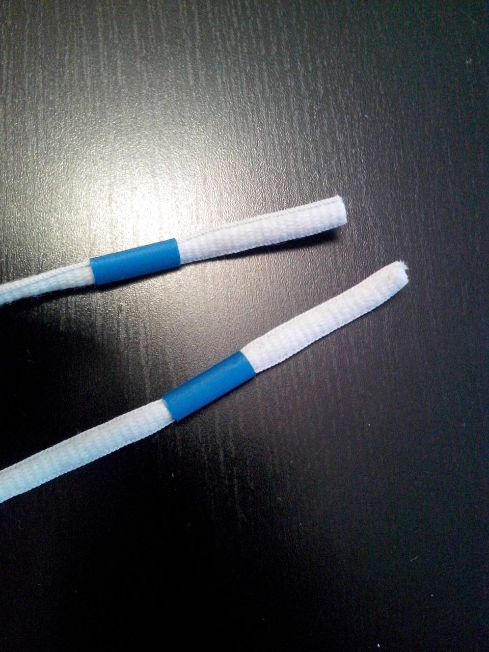 Все, что требуется сделать со шнурками, — отметить нужную длину, отрезать лишнее, оставив запас около 7–10 мм. Далее нанести на кончик каплю клея и придать ему конусовидную форму. Во время выполнения процедуры на материал нужно слегка надавливать. Способ простой, но эффективный. Единственный его недостаток — после работы придется отмывать пальцы от клея.