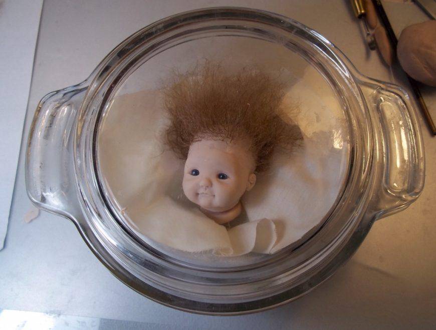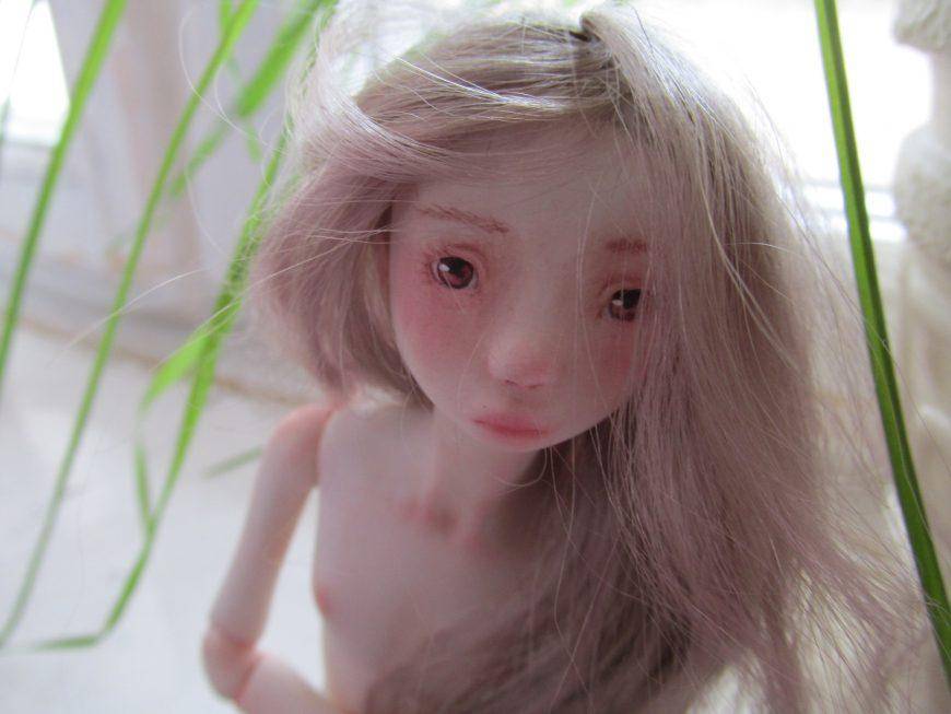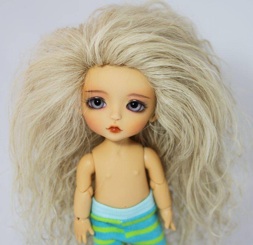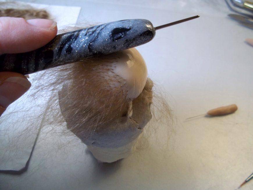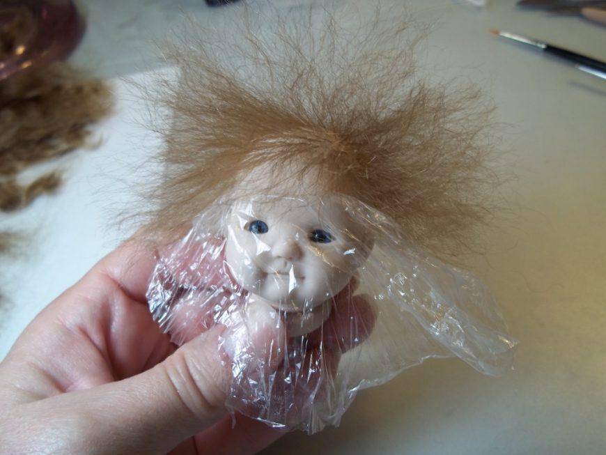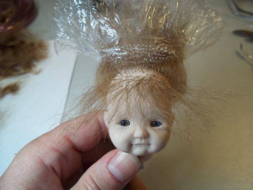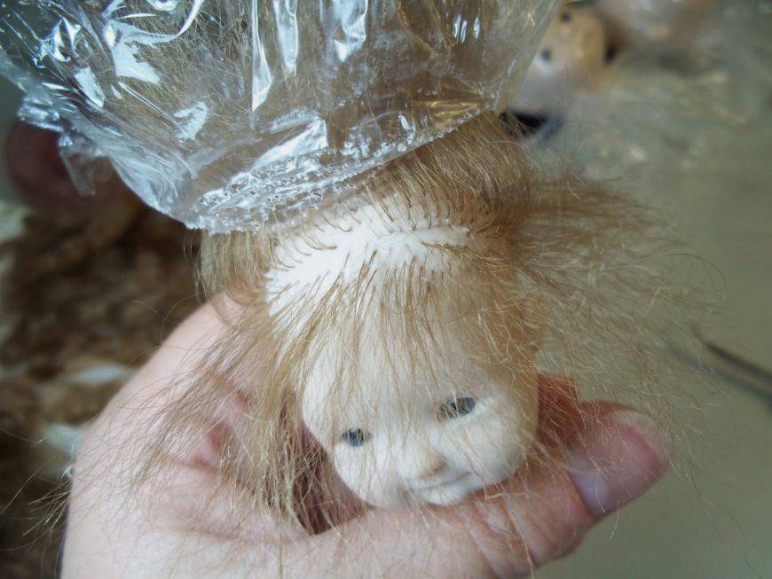 Высушенные локоны можно разделить пальцами и придать им более натуральный вид. Если у куклы были проделаны отверстия в ушах для сережек, то их надо закрыть ватой.