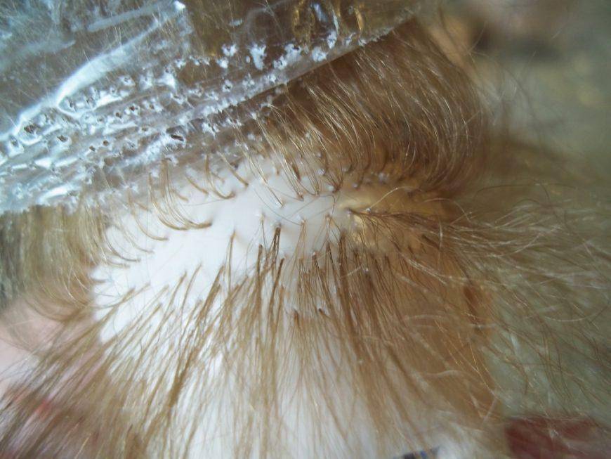После нанесения клея к получившемуся шву следует приложить иглу. Волосинки следует плотно прижать к игле. Это поможет клею проникнуть среди всех волос. Игла не убирается до тех пор, пока не высохнет клей.