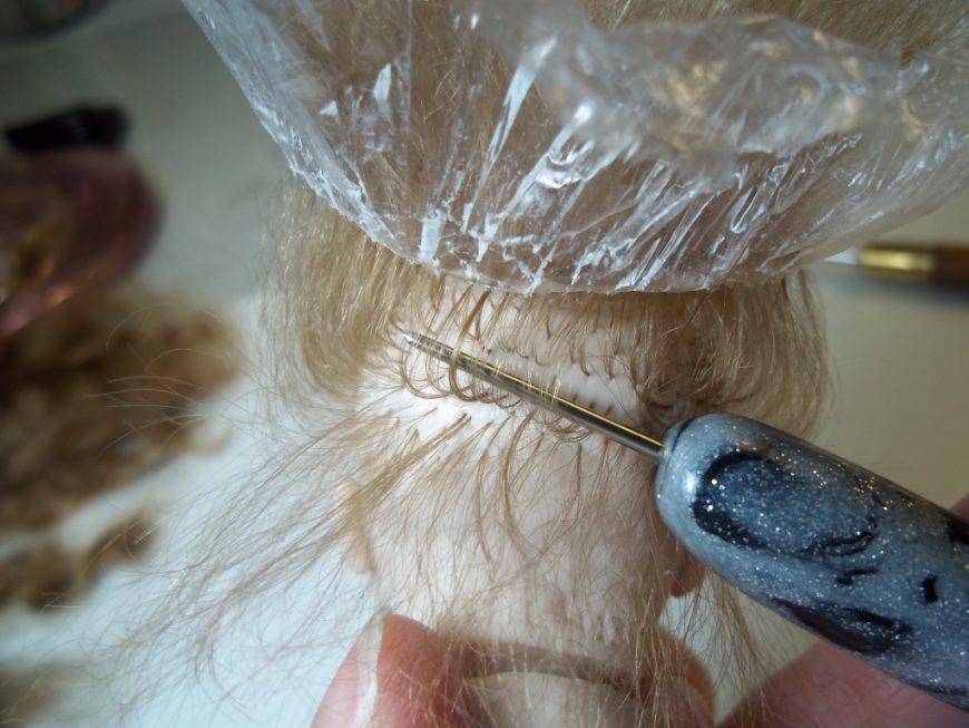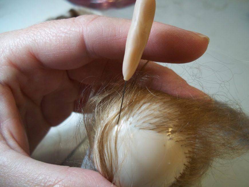 После засыхания клея и удаления иглы, останется парик с уже готовым пробором.
