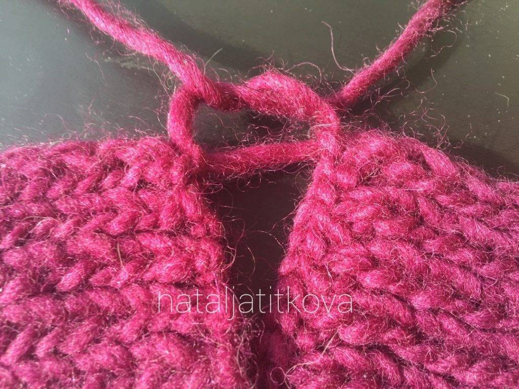- берём связанный шарф, при этом хвостик нитки оставляем для соединения сторон;