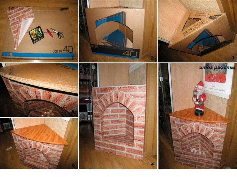 Одними из самых популярных каминов являются угловые модели, позволяющие значительно экономить место в квартире. Мы с легкостью можем сделать подобный вариант из той же коробки из под телевизора.