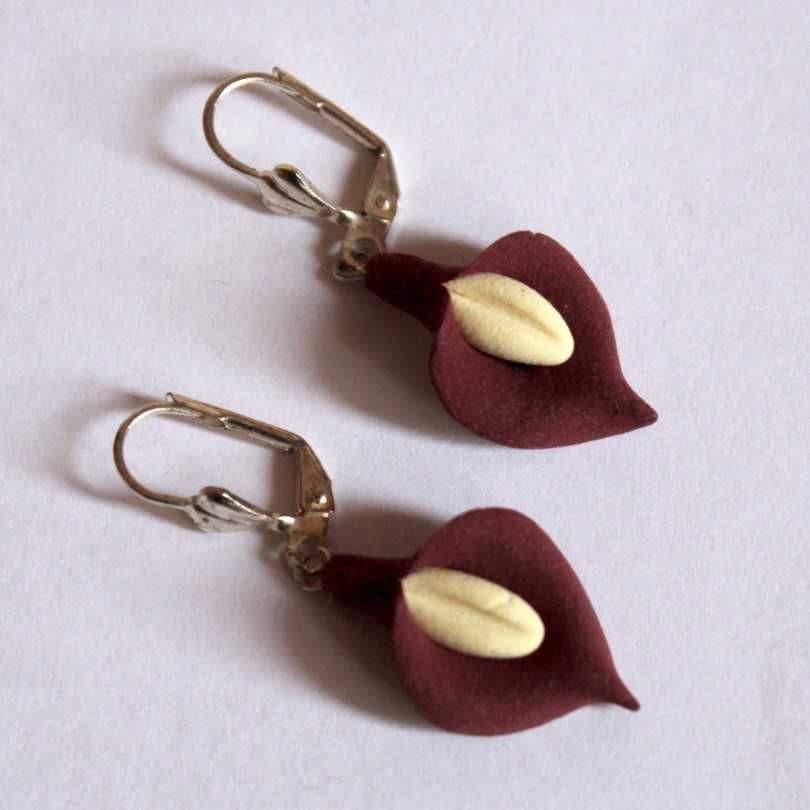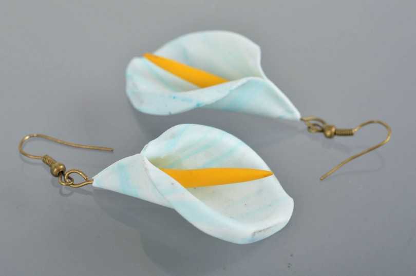 Это нужно для достижения красивого разнотона. Ножом разрезаем шарик на половинки. Из каждой лепим удлиненный, как у каллов, лепесток. Один край защепляется, другой — заворачивается в воронку. В нижней части зубочисткой делаем отверстие для вставки фурнитуры сережек. В качестве сердцевины используются нанизанные на зубочистку бусины или бисер.