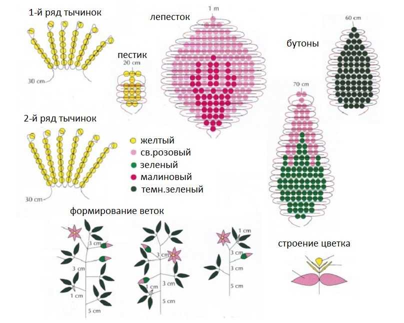 Приготовьте бисерины малинового, розового, желтого и зеленого цвета. Еще необходимы две тонкие проволочки серебристого и изумрудного оттенка. В этом уроке веточка данного изделия будет состоять из одного бутона и четырнадцати листков. Подробная схема по изготовлению поделки будет продемонстрирована ниже по тексту.