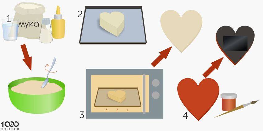 После этого раскатаем созданное тесто скалкой до толщины примерно 1 см. На картоне изобразим фигуру — к примеру, сердце. Вырезаем заготовку, наложим ее на наше тесто, после этого медленно острым ножиком вырежем такую же фигуру из . Поместим ее в теплое место на сутки.