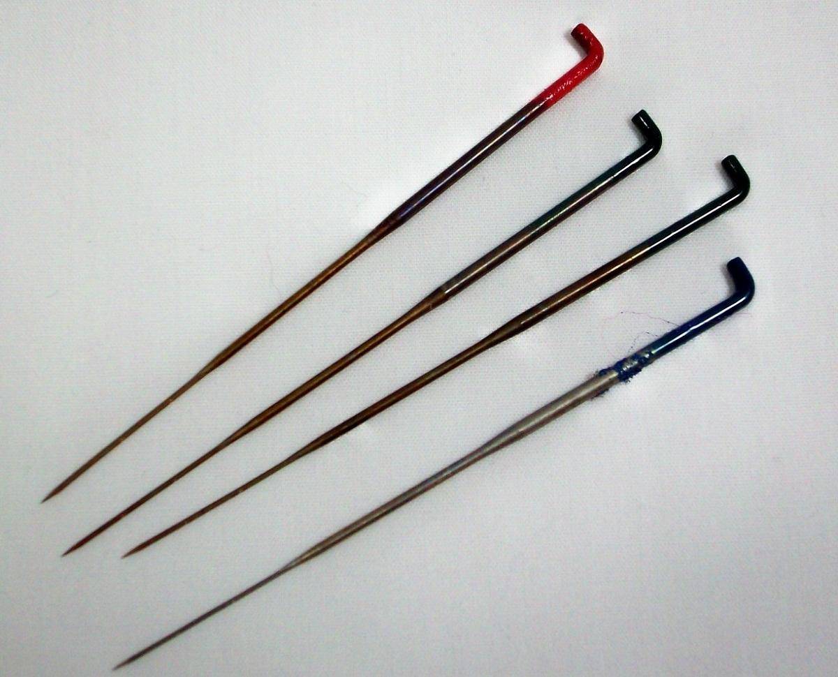 Швейные иглы – это применение технологии изготовления проволоки, которая начала появляться во втором тысячелетии до нашей эры. Некоторые прекрасные образцы вращающих моментов из золота бронзового века сделаны из очень прочной золотой проволоки, которая более податлива, чем бронза. Однако медные и бронзовые иглы не обязательно должны быть такими длинными: ушко можно сделать, повернув проволоку обратно на себя и перемотав ее через матрицу .